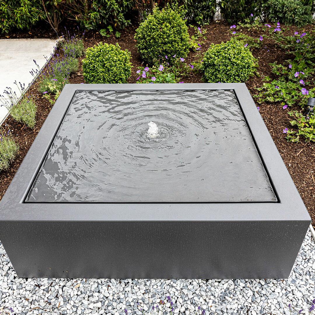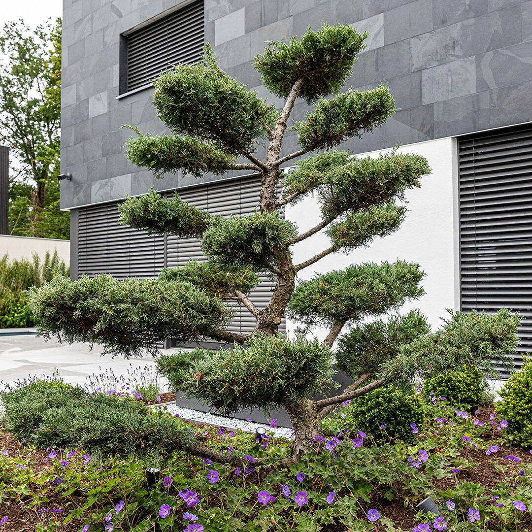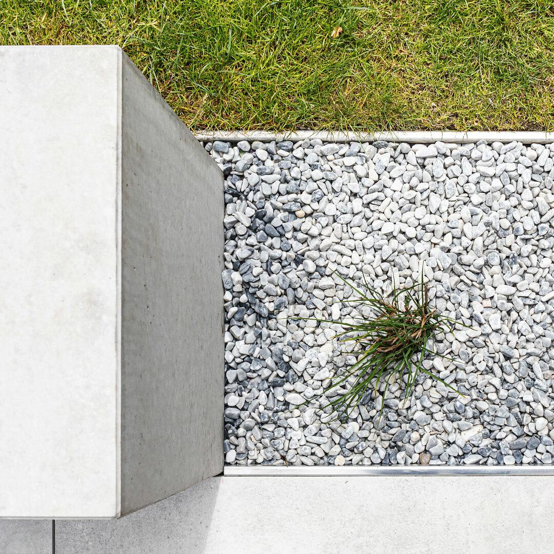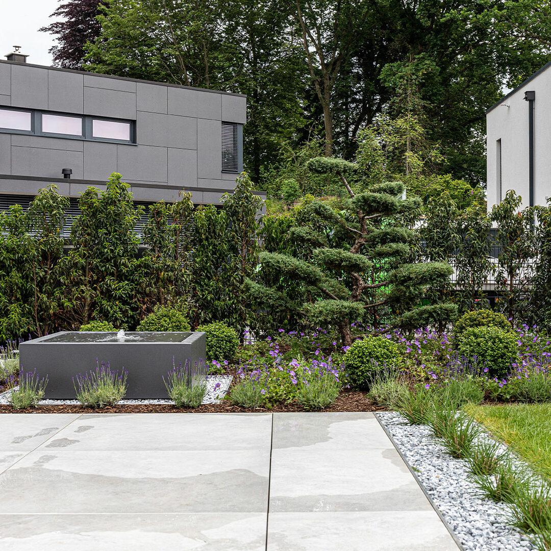 Die Modernität des Designs wird durch verschiedene Gartenaccessoires wie eine spielerische Wassertischinstallation und eine Möblierung aus Sichtbeton unterstrichen. Zur Schaffung eines Rückzugsortes inmitten der Natur, wurden eine Bambushecke, die immergrüne Heckenpflanze portugiesischer Lorbeer sowie Glanzmispel in Form von Spalierhochstämmen gepflanzt.