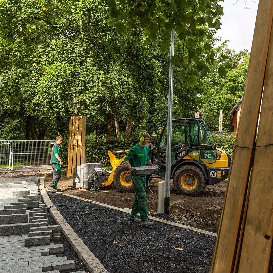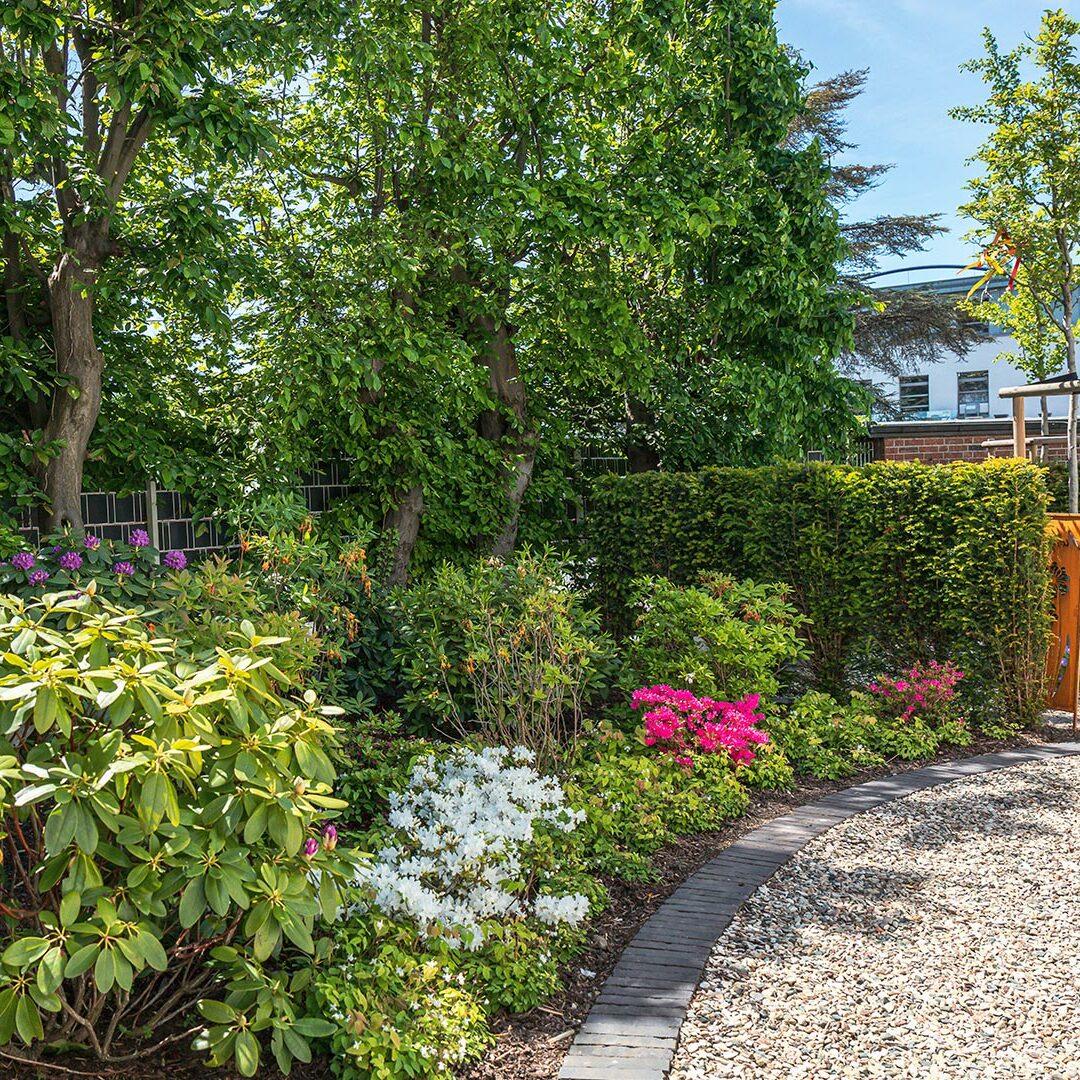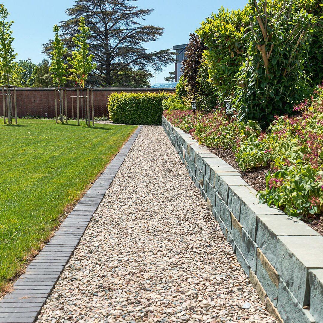 Die Gestaltung mit Steinelementen findet auch im restlichen Garten ihren Platz: Die Wegeflächen und -einfassungen wurden mit holländischem Pflasterklinker angelegt und die Fahrflächen sind aus Lippekies. Abgegrenzt wird der Hausgarten von einem modernen Zaun in klassichem Stil.