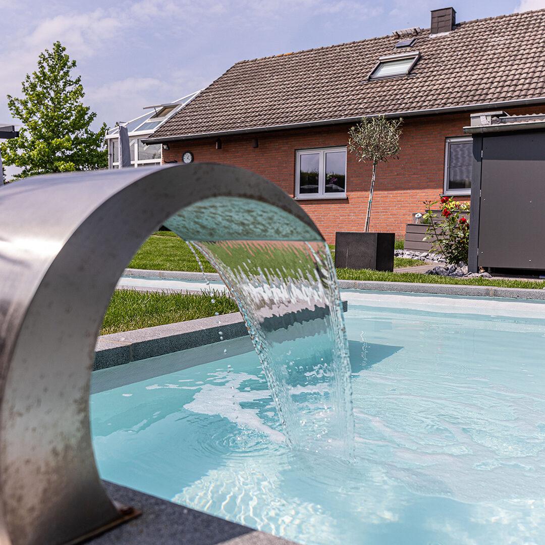 Ein besonderes Highlight bietet der Schmuckpool im Privatgarten des Hauses, der mit einem L-förmigen Wasserbecken direkt an die Terrasse anschließt. Diese ist mit Naturstein eingefasst, die durch Keramikplatten in gebundener Bauweise realisiert wurde und sich auch bei der Umrandung des Pools wiederfindet.