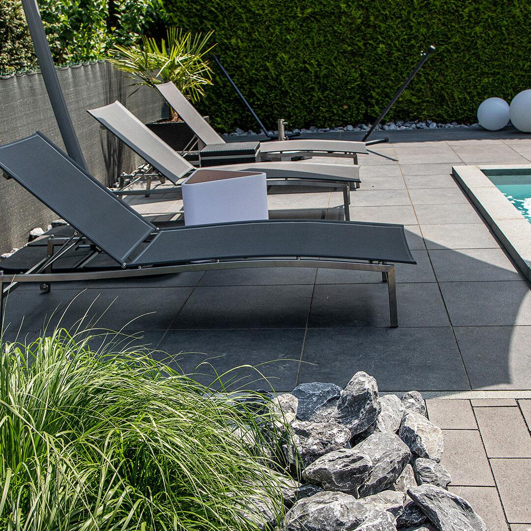 Nach modernem Stil und höchsten Qualitätsstandards wurde der Hausgarten einer Bauhausvilla passend zum Design des Wohngebäudes gestaltet. Auf der Terrasse wurden hochwertige und großformatige weiße Keramikplatten mit den Abmessungen 1,20m x 1,20m verlegt. Integriert darin ist eine rechteckige Poolanlage der Firma C-Side mit entsprechender Poolrandeinfassung.