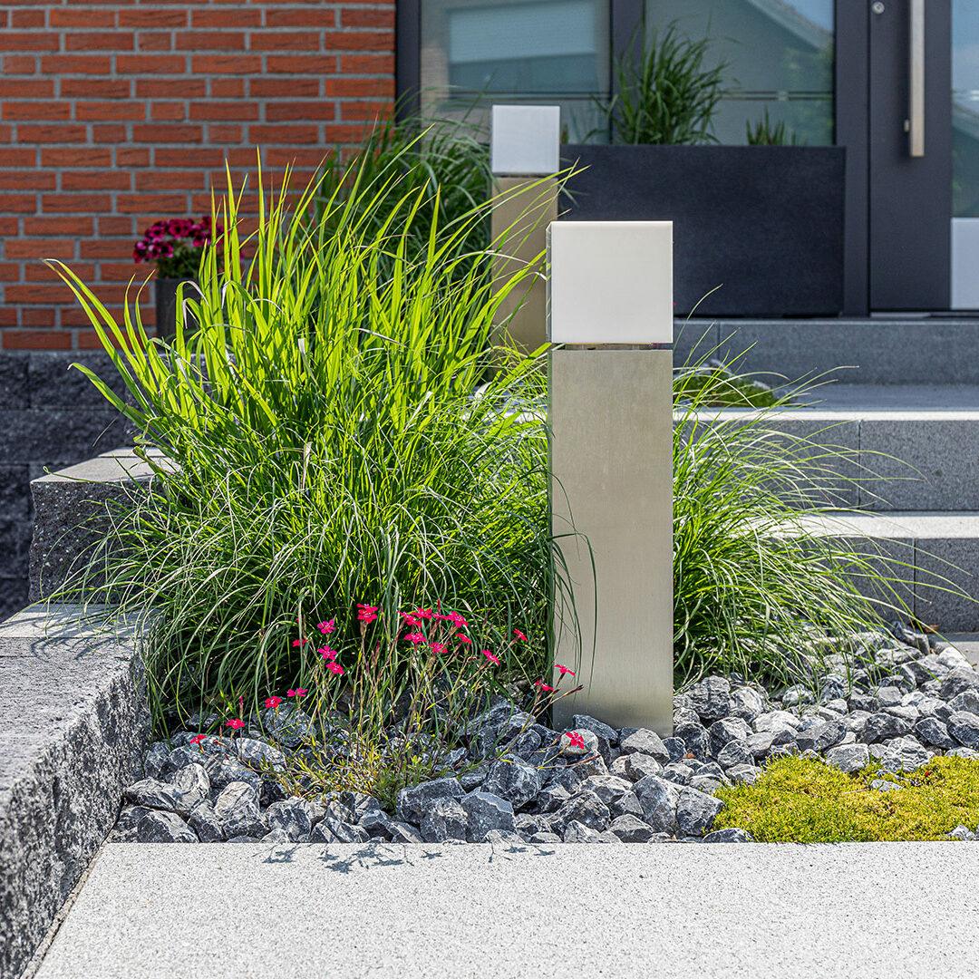 Die hier erstellte Treppenanlage fokussiert durch ihre formale Form den Blick des Betrachters auf den Eingang. Hier wurde Wert auf Symmetrie gelegt. Dies wurde durch die wegbegleitenden Beetflächen, sowie die seitliche Einfassung der Treppenanlage mittels Natursteinsteelen erreicht.